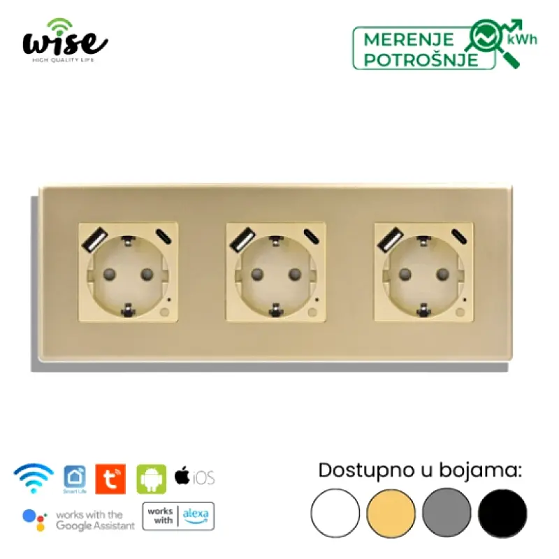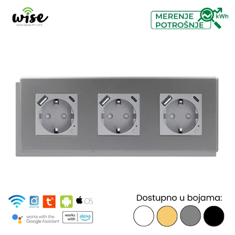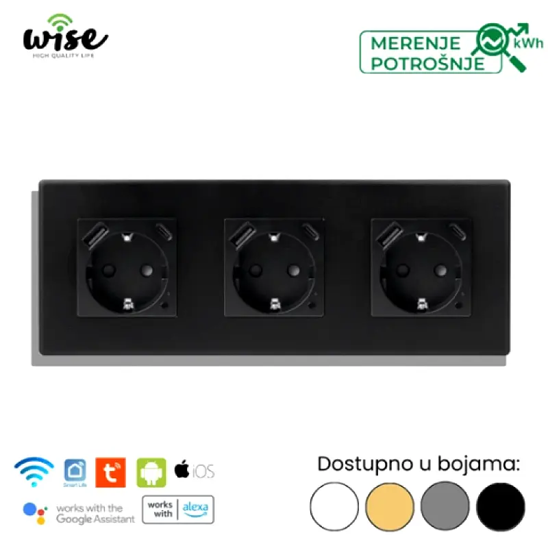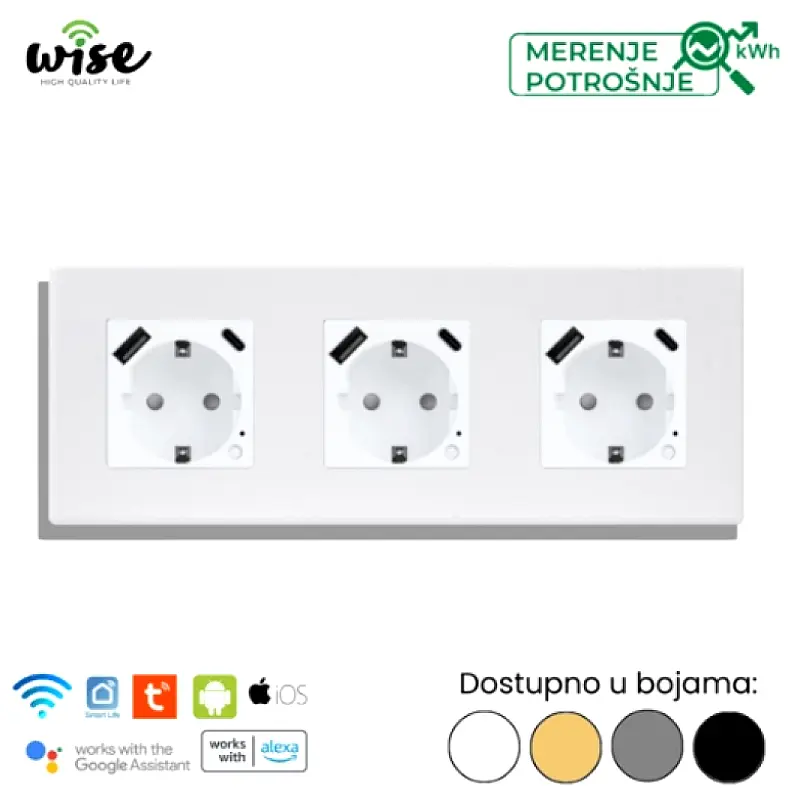 Wise trostruka pametna utičnica 16A sa merenjem potrošnje + USB A/C punjač PVC panel