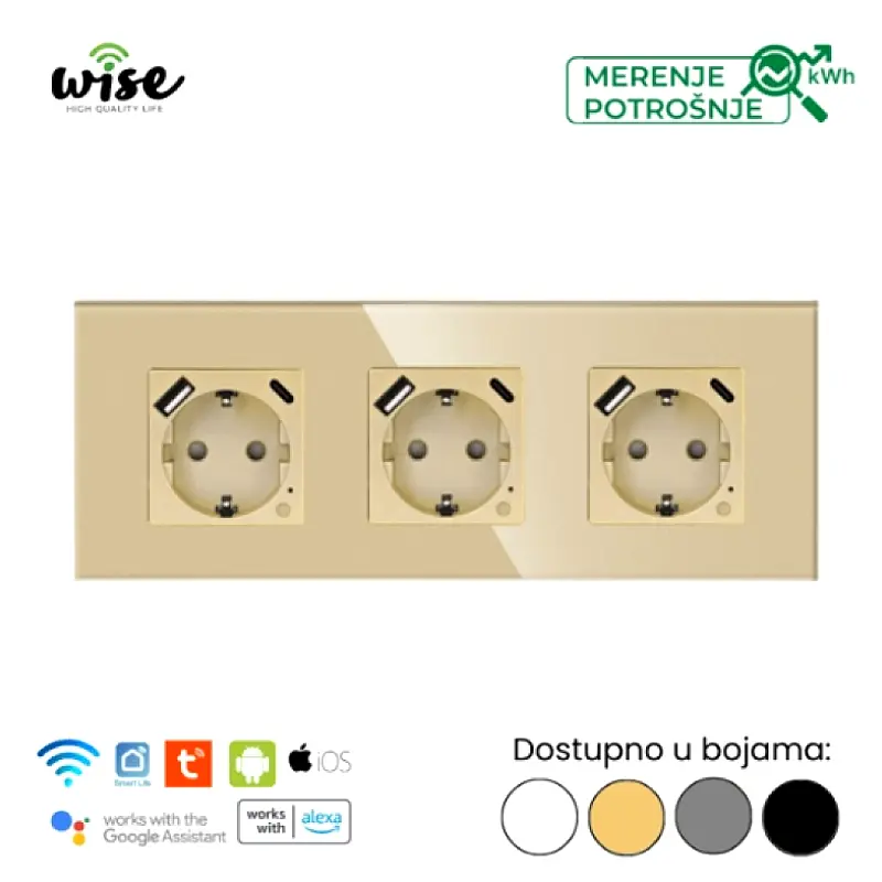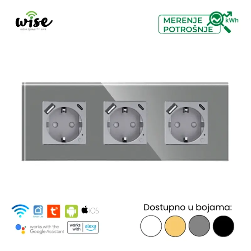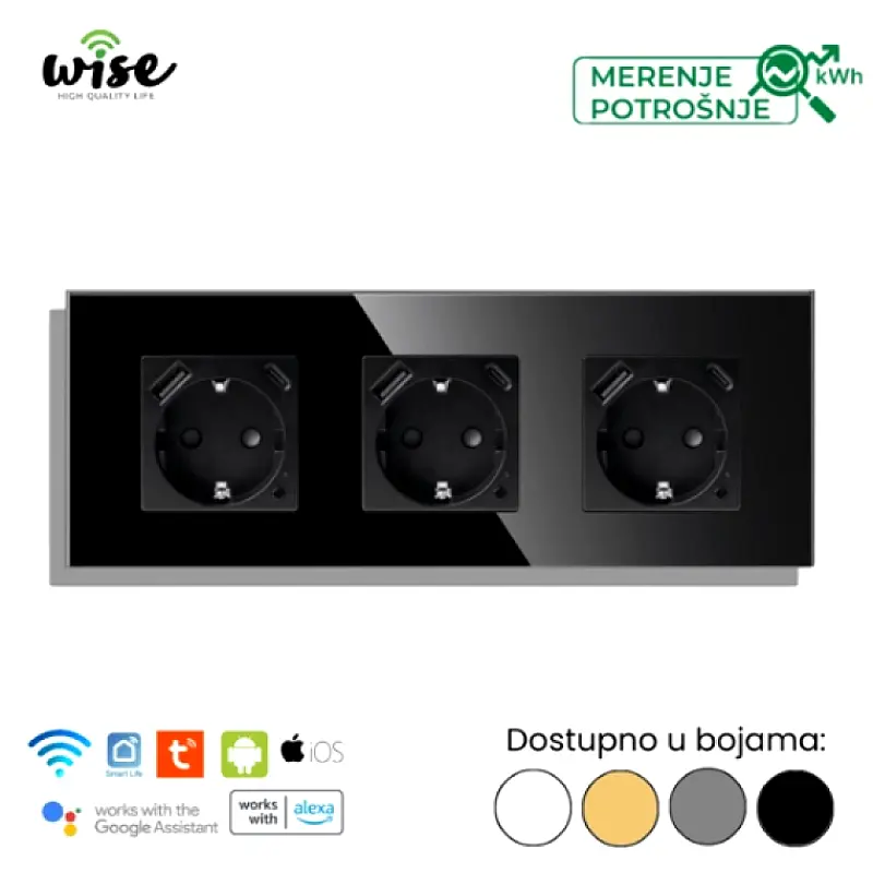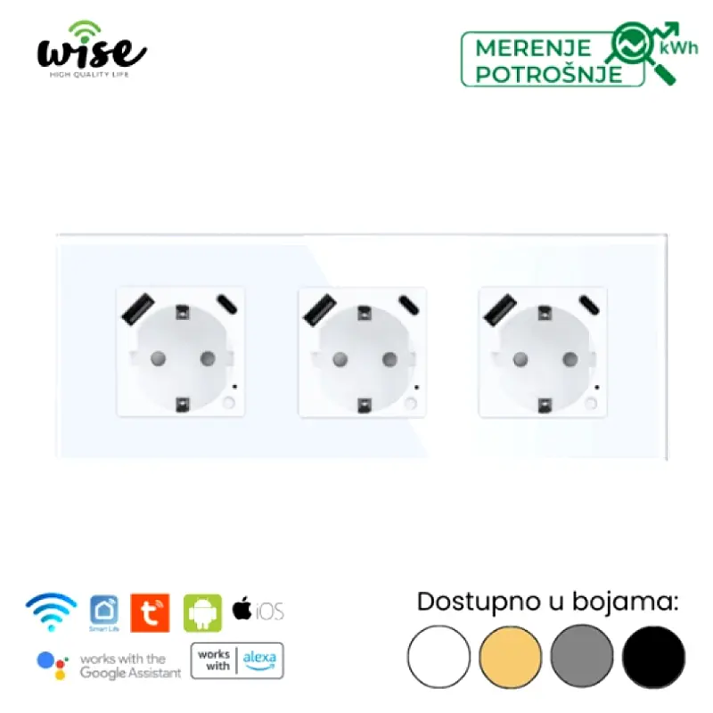 Wise trostruka pametna utičnica 16A sa merenjem potrošnje + USB A/C punjač stakleni panel